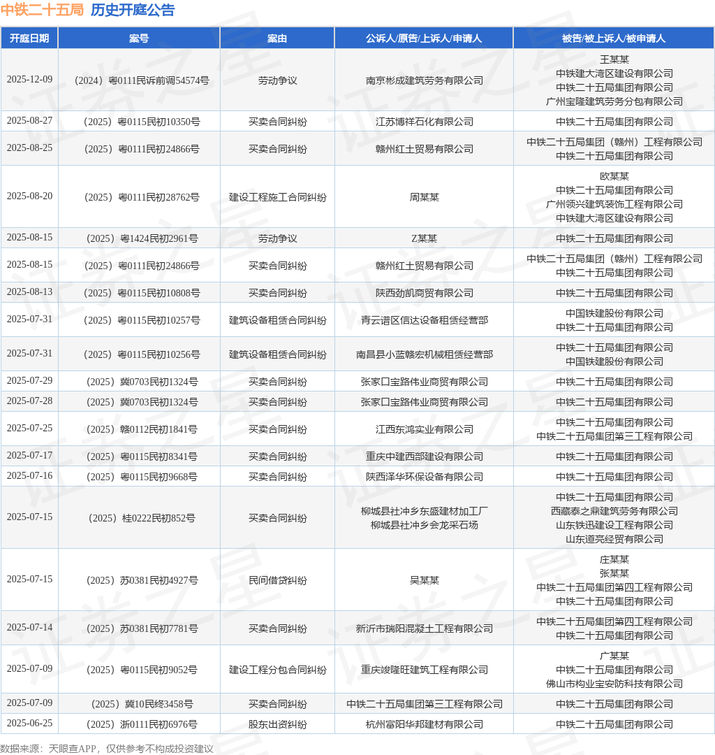 本站消息,根据天眼查APP显示,近日公布了一则中铁二十五局集团有限公司作为被告/被上诉人的开庭公告,详细内容如下: